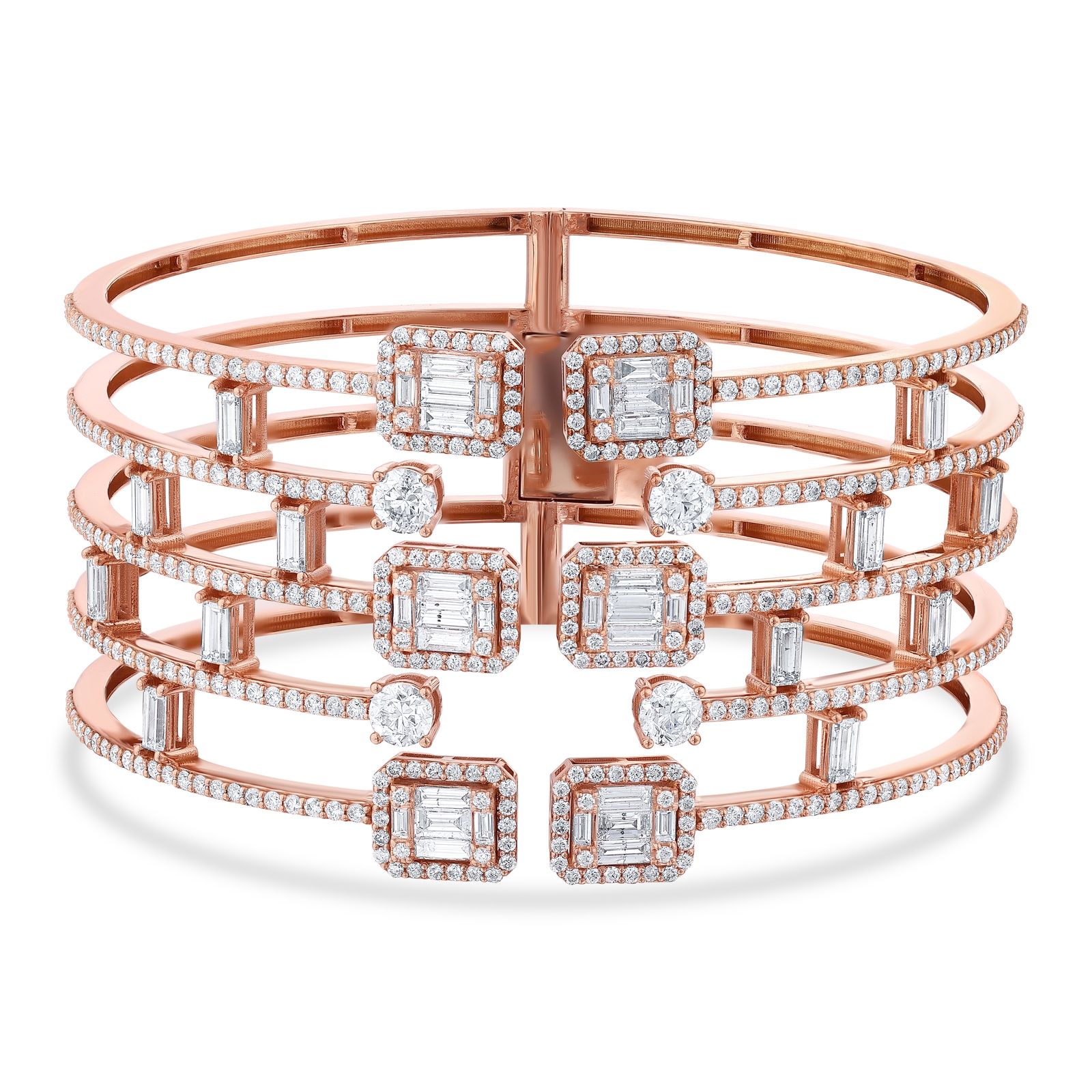 Pırlantaları her kadın sever ama bazıları gösterişli olanları tercih eder. Kelepçe bileklik modellerine ilgi yoğundur. Şatafatlı ürünler arasında 11.34 Karat Pırlanta Baget Kelepçe Bileklik vardır. Dört sıra halindeki bilekliğin üzerinden yüzlerce pırlanta bulunur. Birbirine bağlı bantlar yarıya kadar pırlanta ila kaplıdır.