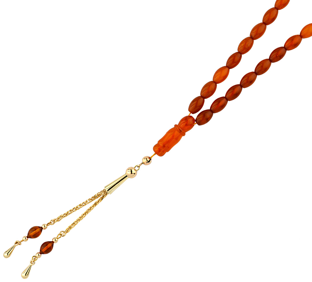 Altın kehribar tesbih (has taşlı), incelikle zarafeti bir araya getiren nadide parça. Özel tasarımıyla göz kamaştırırken 14 ayar sarı altınla işlenmesi kalitesini simgeler. 3.70 gram ağırlığıyla hem hafif hem kullanışlı. Altın rengini tamamlayan eşsiz hava katan kehribar taşlarıyla bezeli.